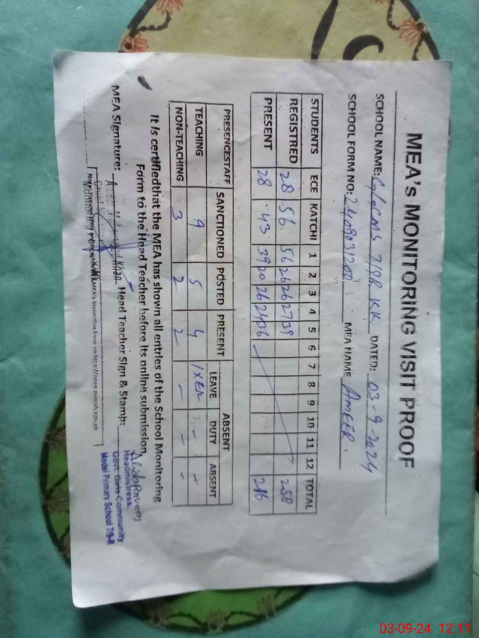 | Attendance Register | Head Teacher | MEA with School | Visit Proof |