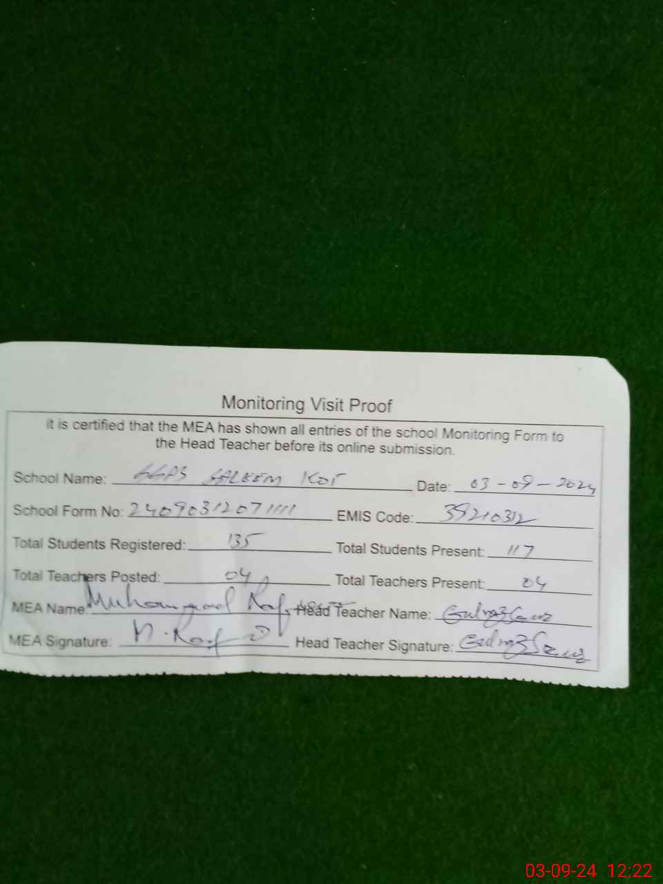 | Attendance Register | Head Teacher | MEA with School | Visit Proof |
