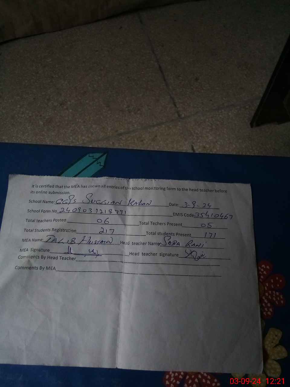 | Name: SA**** RA**** Designation: (School Headmaster's/Headmistress's) PST Phone/Cell Number: 03**** |