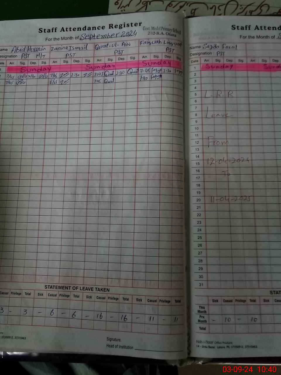 | Leave | Duty | Absent | Maternity | Medical | Ex- Pak |