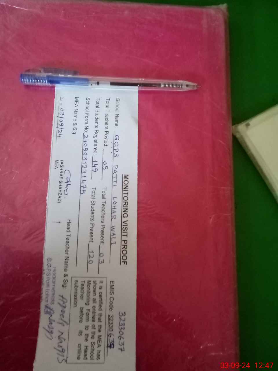 | Attendance Register | Head Teacher | MEA with School | Visit Proof |