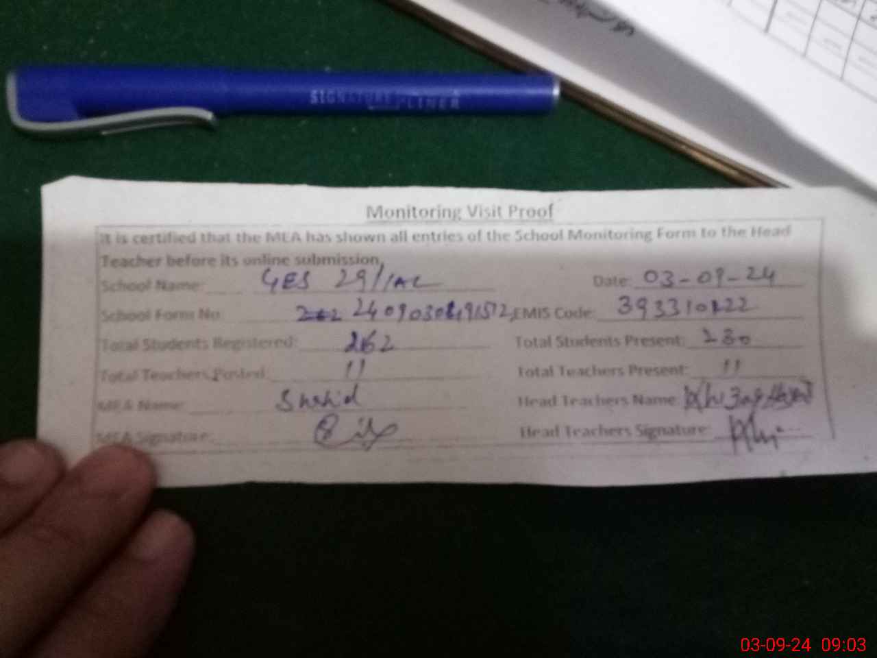 | Attendance Register | Head Teacher | MEA with School | Visit Proof |