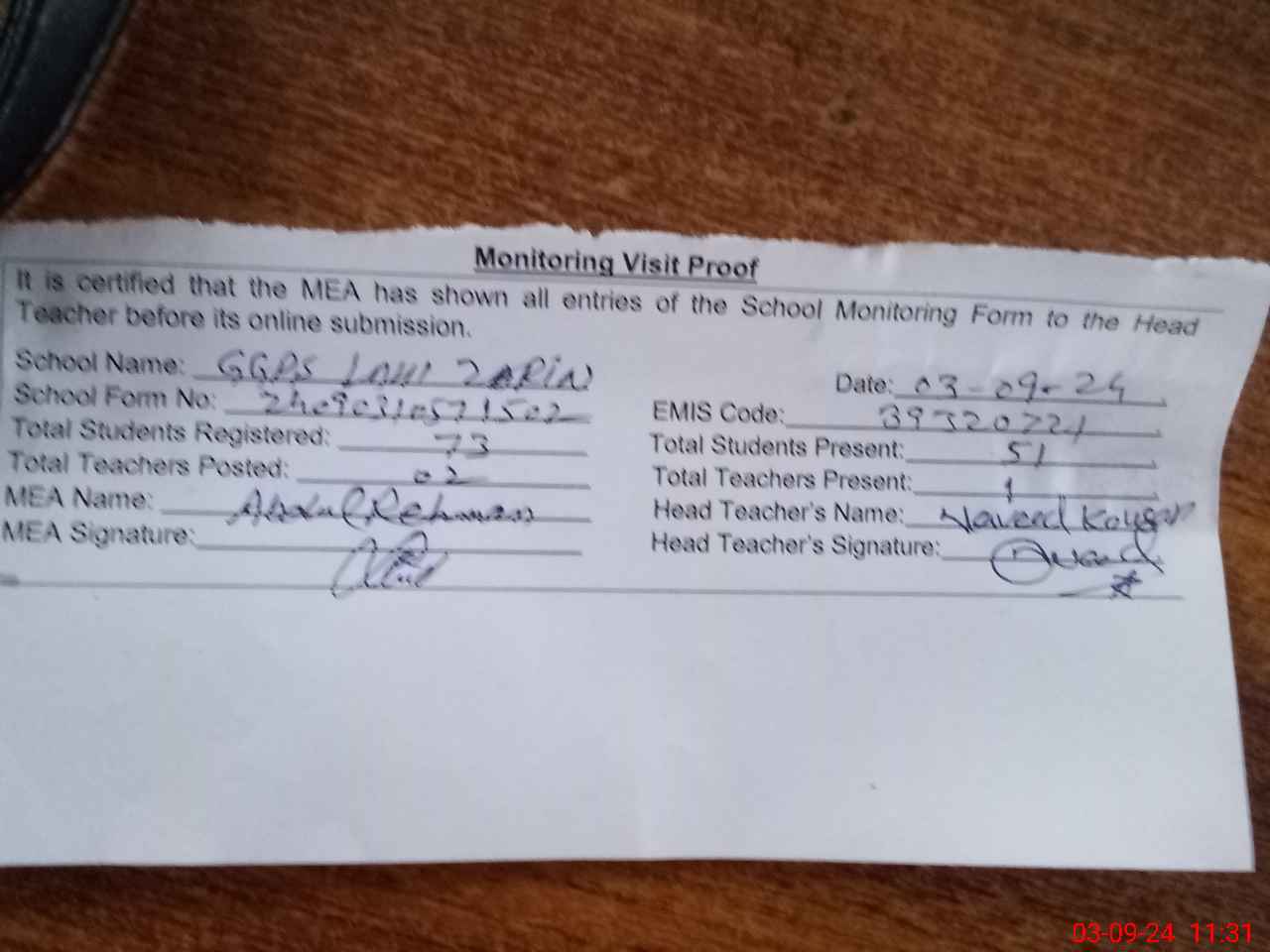| Attendance Register | Head Teacher | MEA with School | Visit Proof |