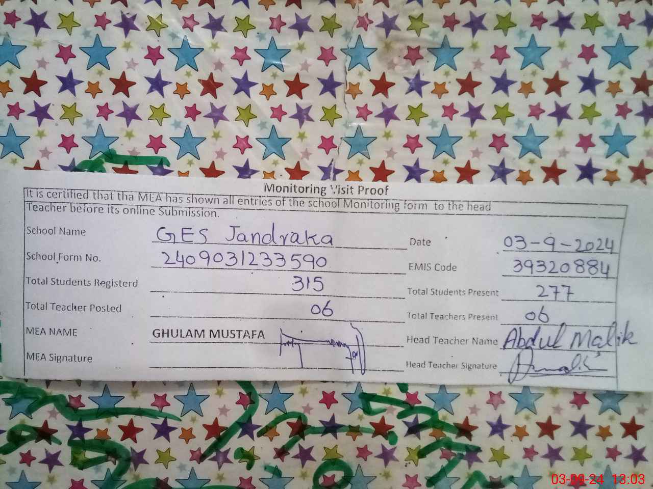 | Attendance Register | Head Teacher | MEA with School | Visit Proof |