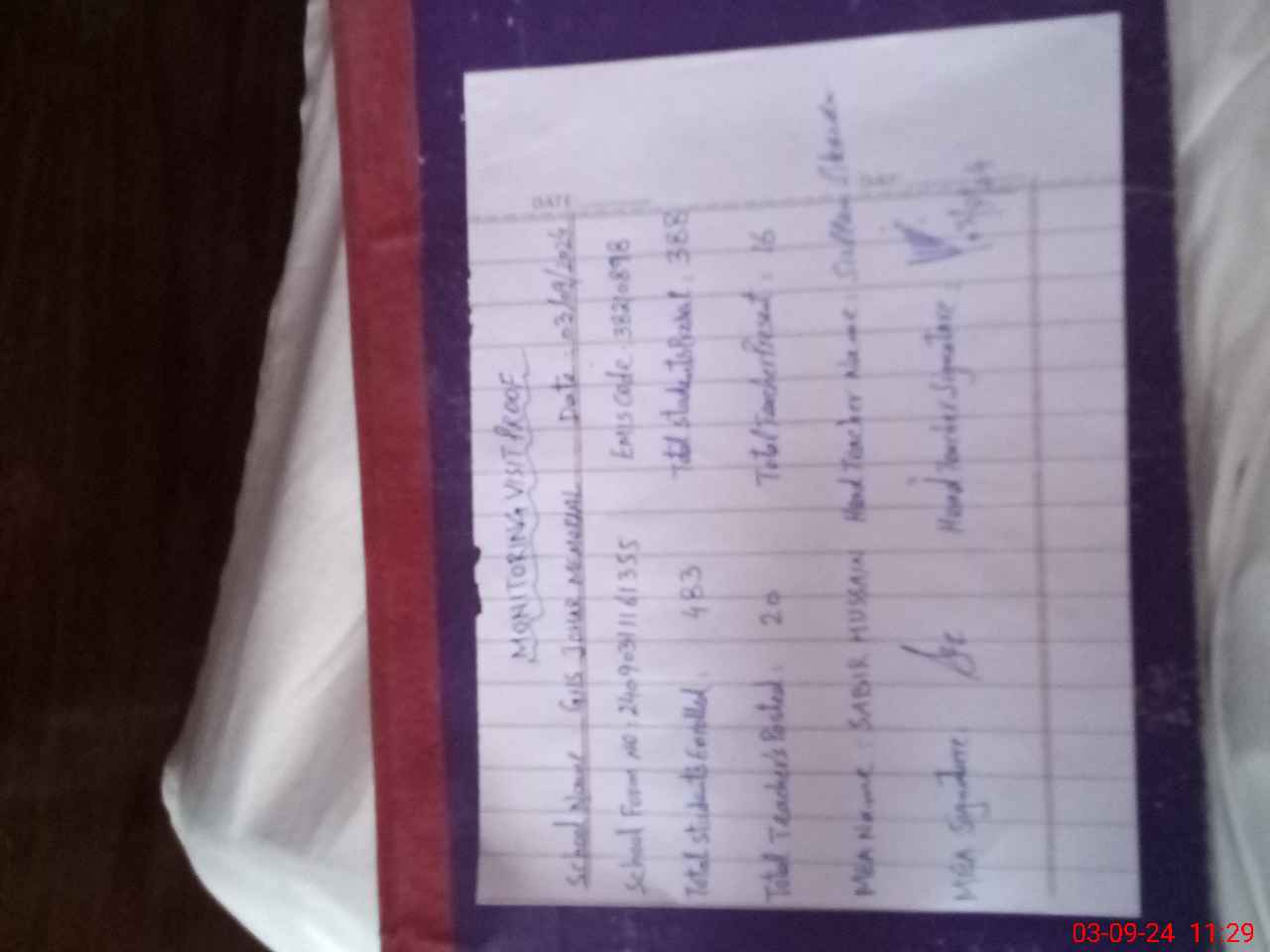| Attendance Register | Head Teacher | MEA with School | Visit Proof |