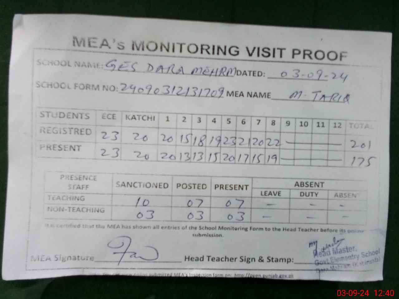 | Attendance Register | Head Teacher | MEA with School | Visit Proof |