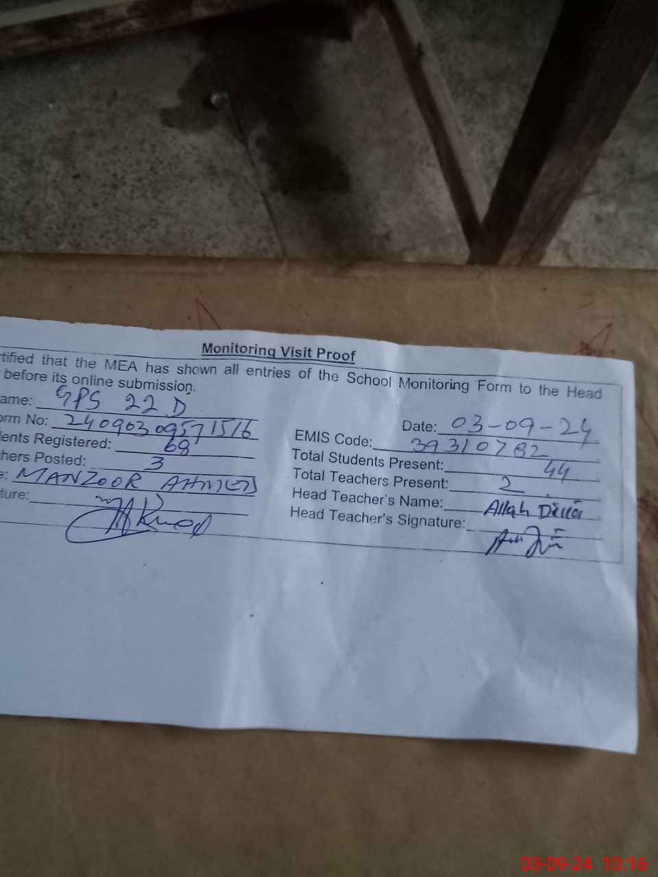 | EMIS Code: 39310782 | Name of School: GPS CHAK NO. 22/D | |||