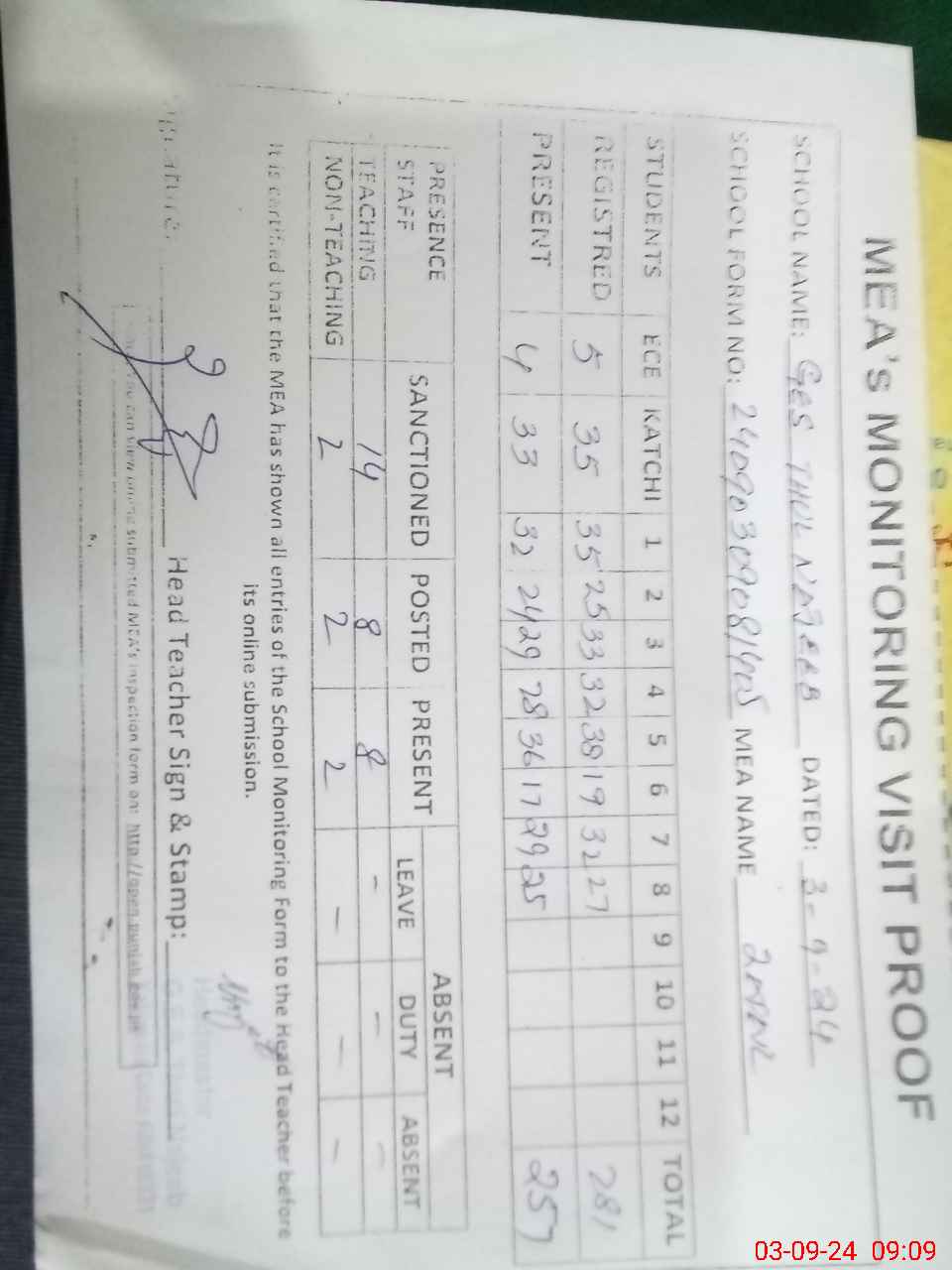| Attendance Register | Head Teacher | MEA with School | Visit Proof |
