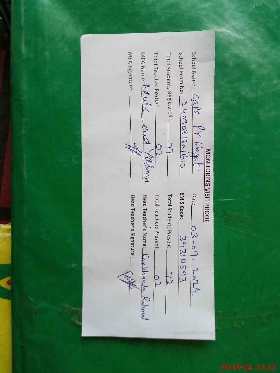 | Attendance Register | Head Teacher | MEA with School | Visit Proof |