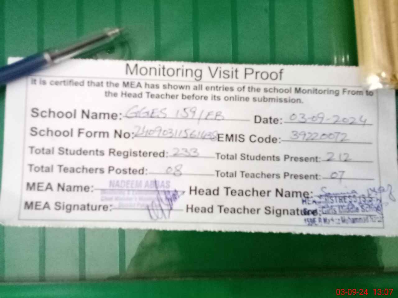 | Attendance Register | Head Teacher | MEA with School | Visit Proof |