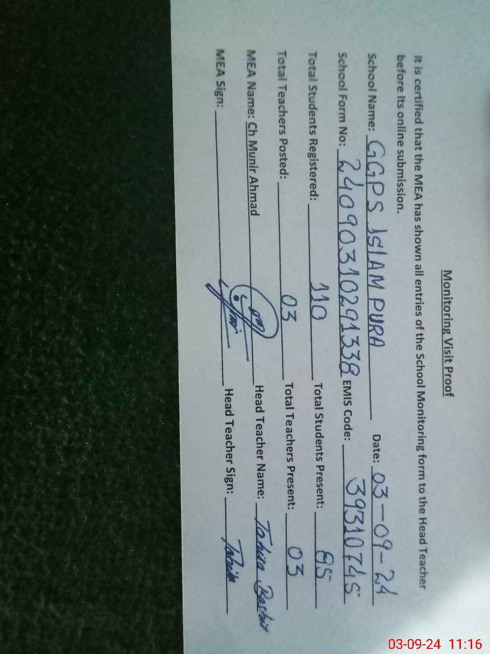 | EMIS Code: 39310745 | Name of School: GGPS ISLAM PURA | |||