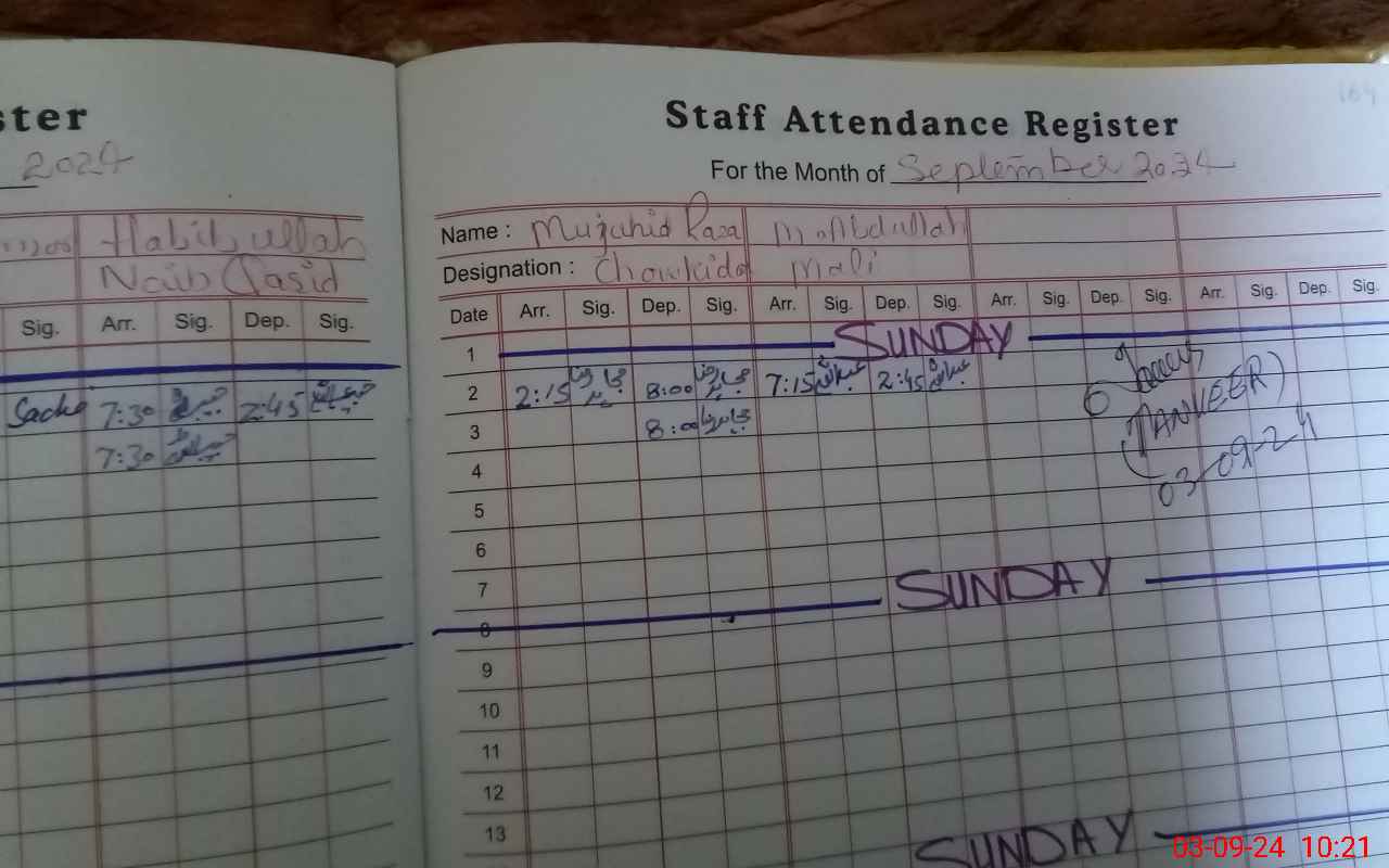| CNIC | Full Name | Designation | R/C | Absence During Last Calender Month |
