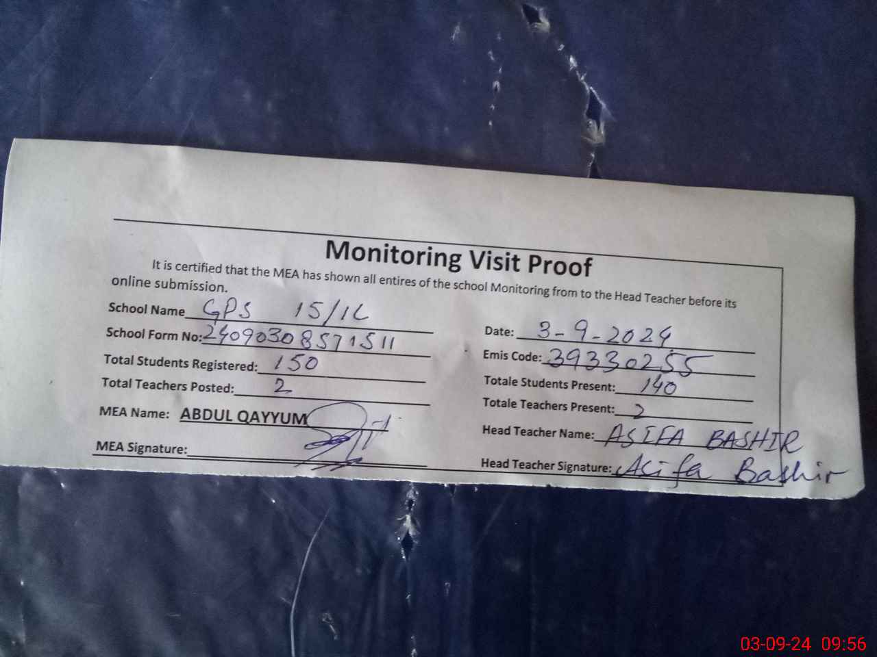 | Attendance Register | Head Teacher | MEA with School | Visit Proof |