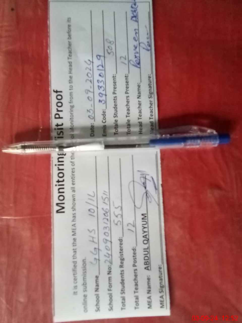 | Attendance Register | Head Teacher | MEA with School | Visit Proof |