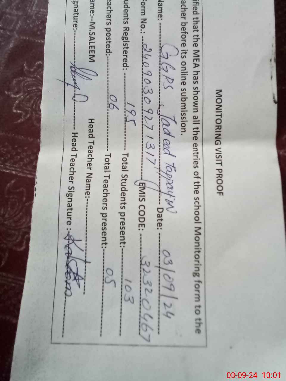 | Attendance Register | Head Teacher | MEA with School | Visit Proof |