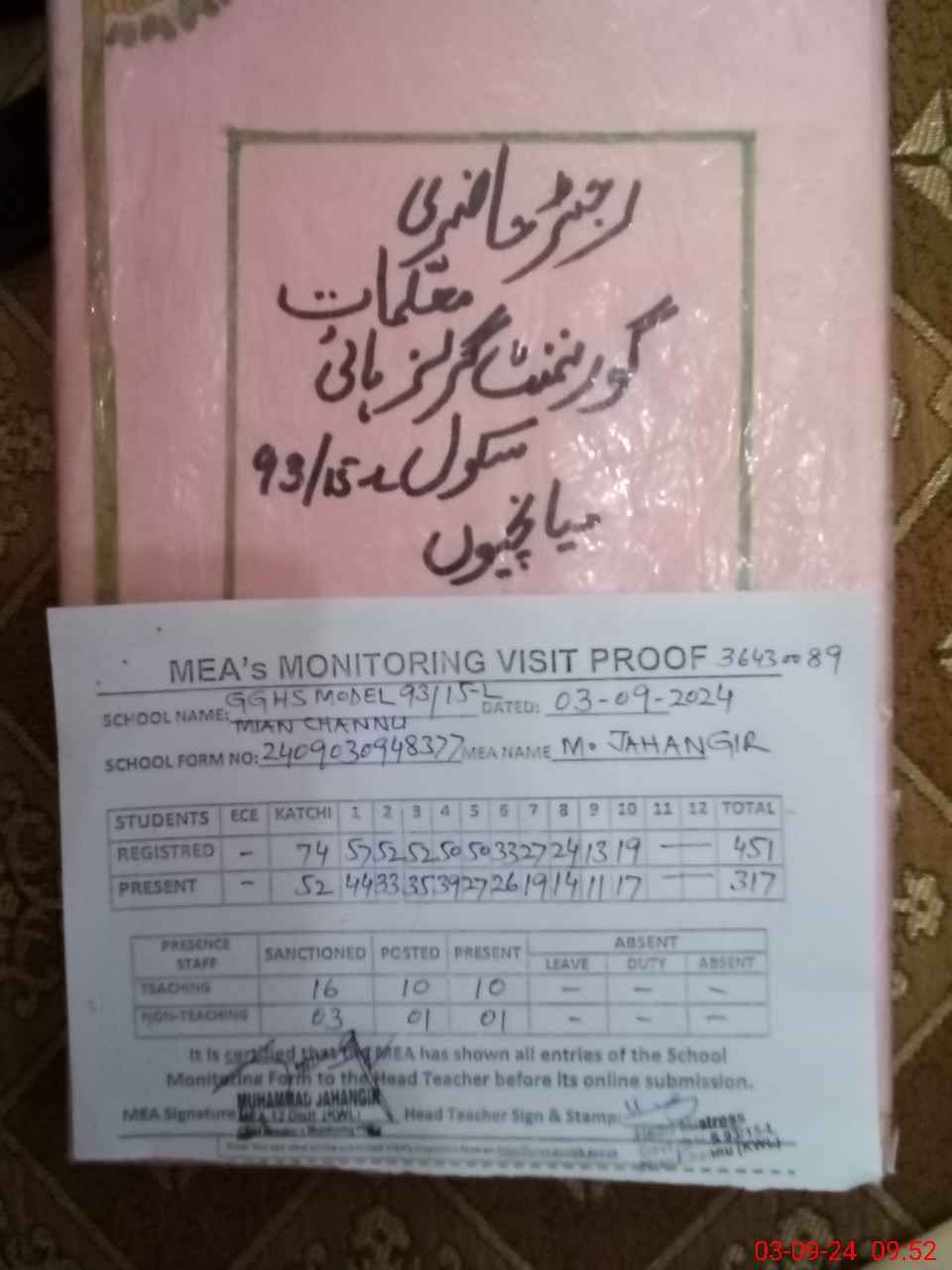 | Attendance Register | Head Teacher | MEA with School | Visit Proof |