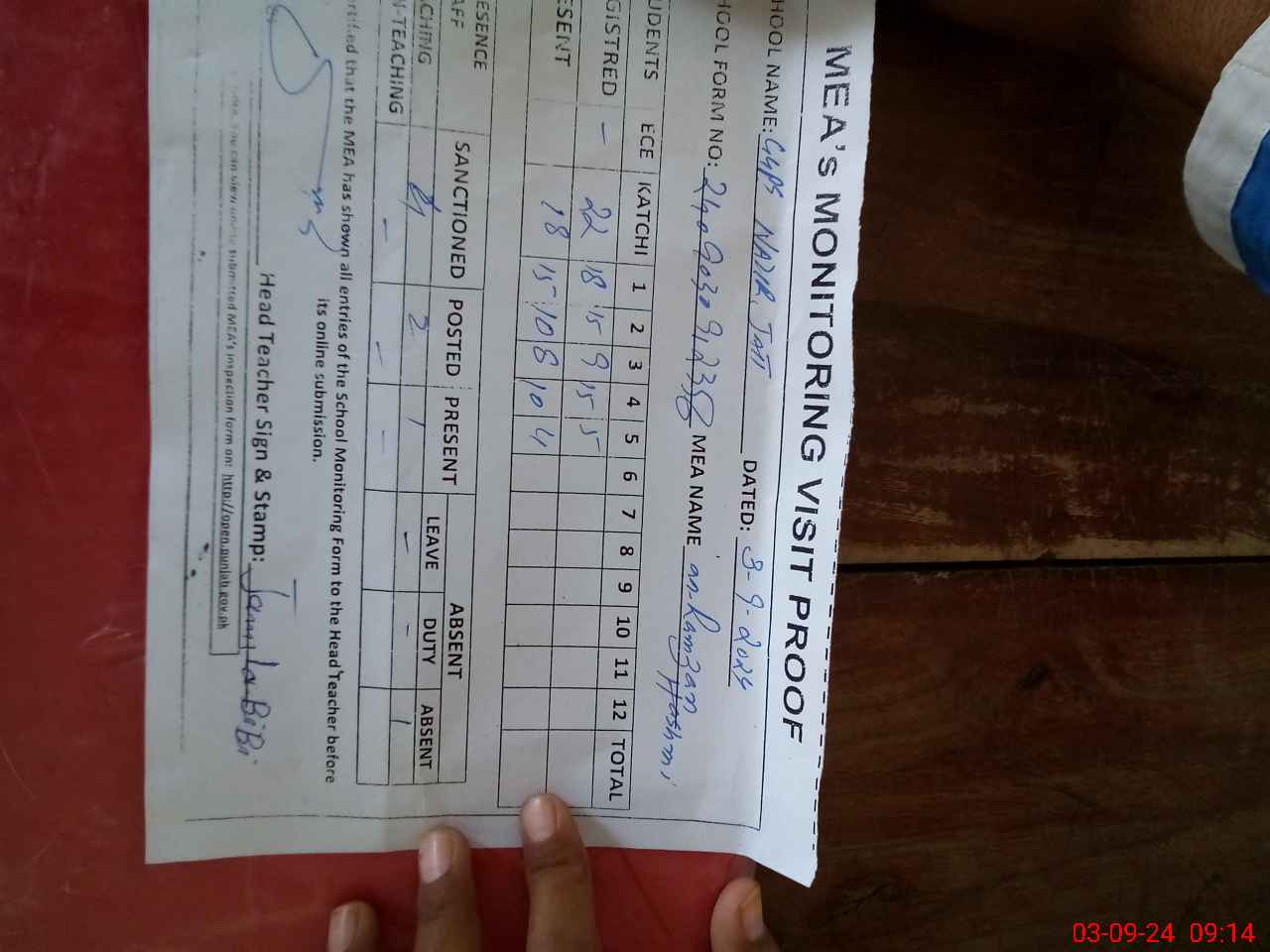 | Attendance Register | Head Teacher | MEA with School | Visit Proof |