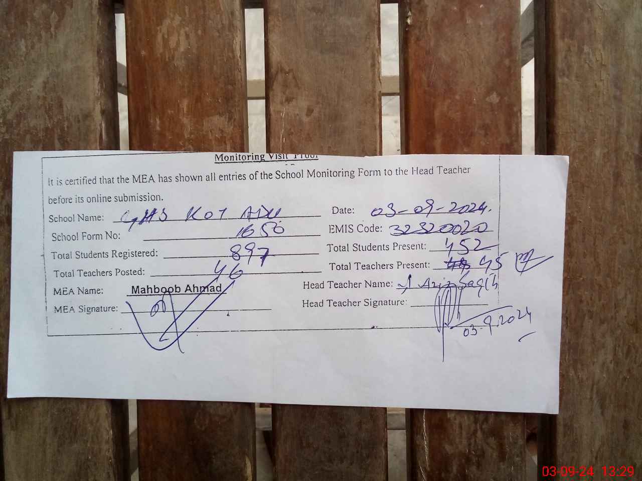 | Attendance Register | Head Teacher | MEA with School | Visit Proof |