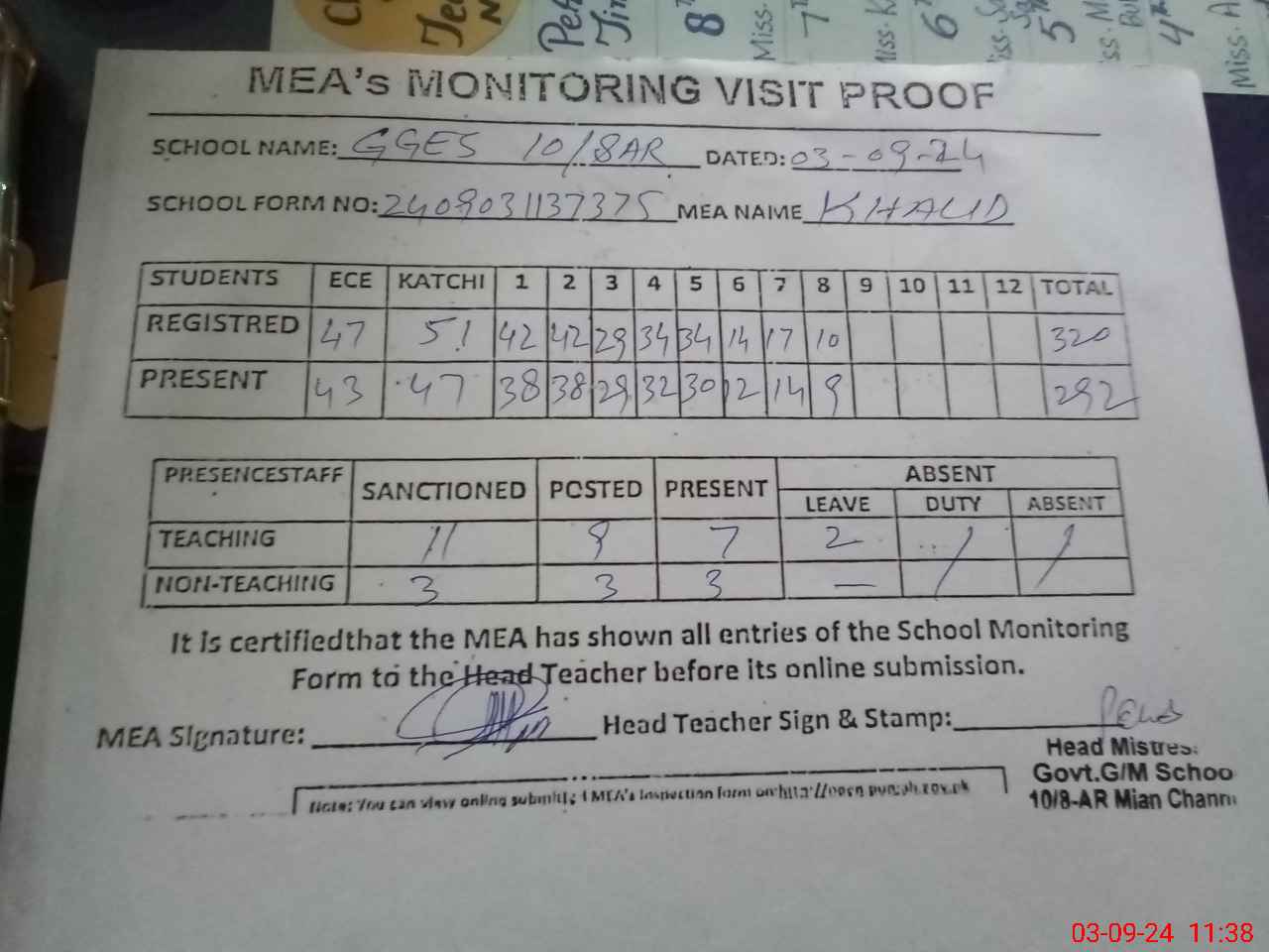 | Attendance Register | Head Teacher | MEA with School | Visit Proof |