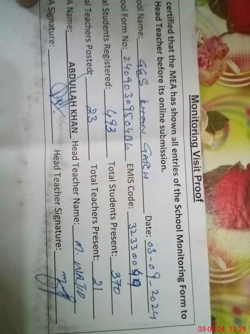 | EMIS Code: 32330049 | Name of School: GES MODEL KHAN GARH | |||