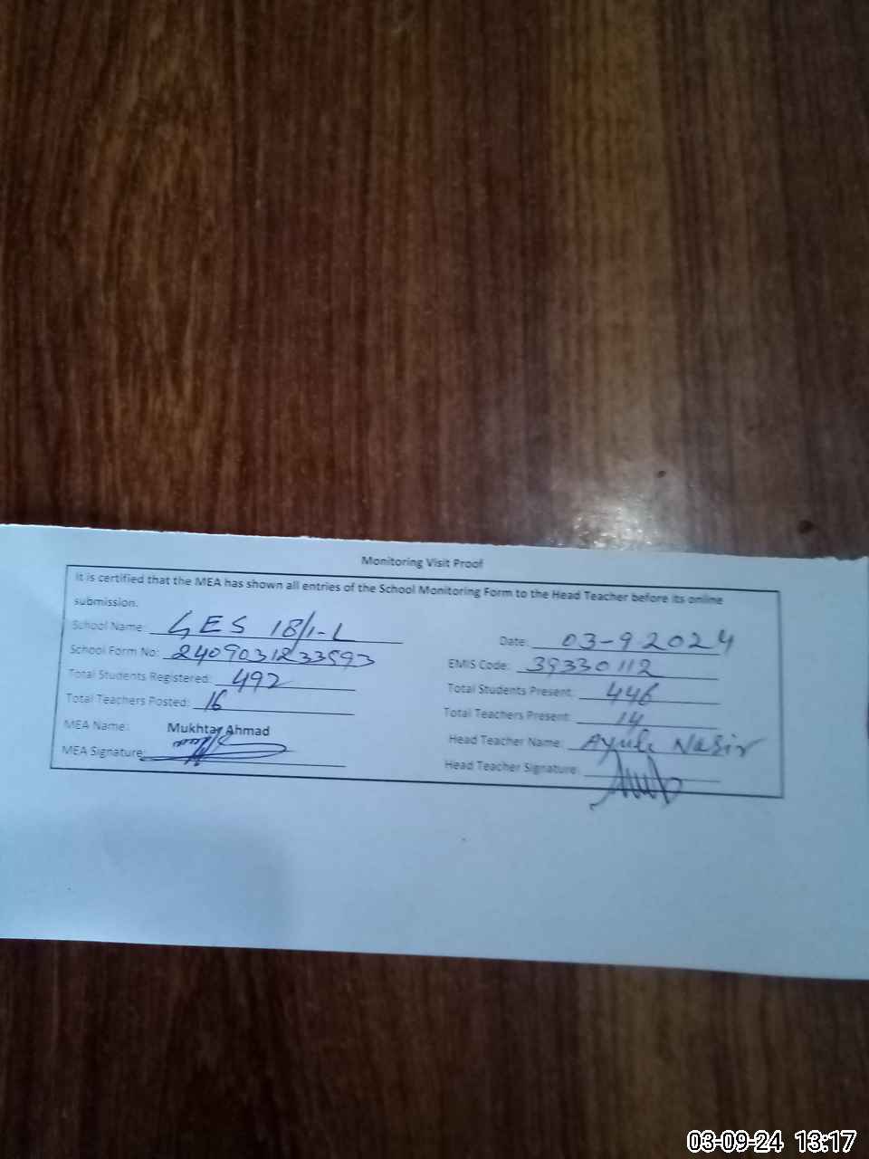 | EMIS Code: 39330112 | Name of School: GES CHAK 18/1-L | |||