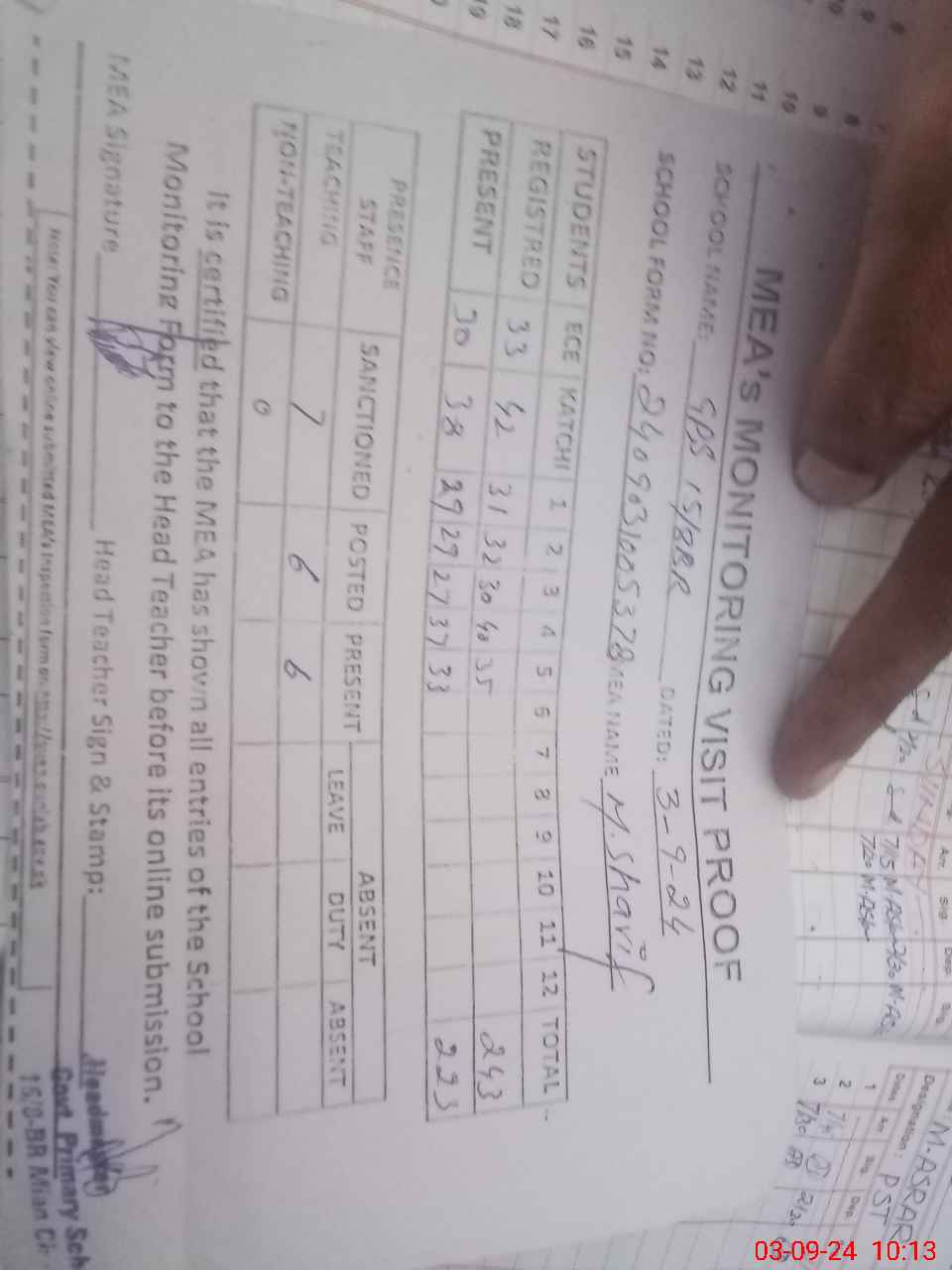 | Attendance Register | Head Teacher | MEA with School | Visit Proof |