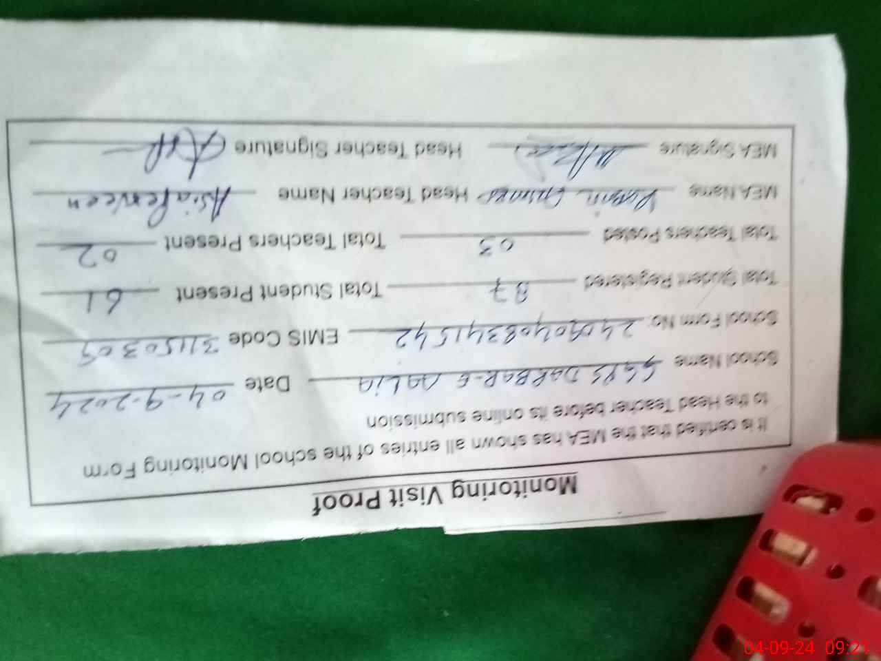| Monitoring Date: 04-09-2024 | Start Time: 04-09-2024 08:33 AM | End Time: 04-09-2024 09:21 AM | Name of MEA: Ka**** Ah**** Sh**** BN**** | |