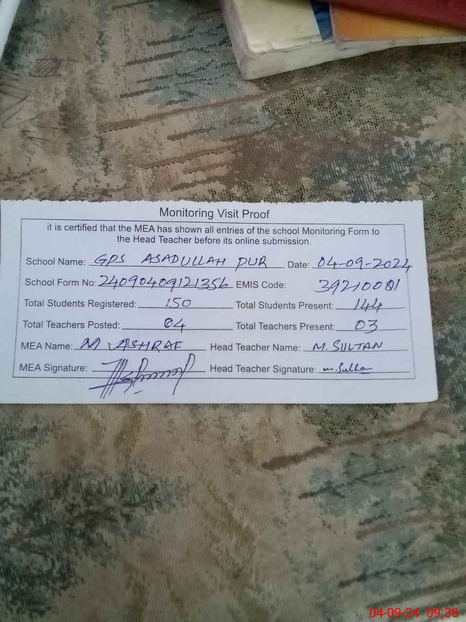 | Attendance Register | Head Teacher | MEA with School | Visit Proof |