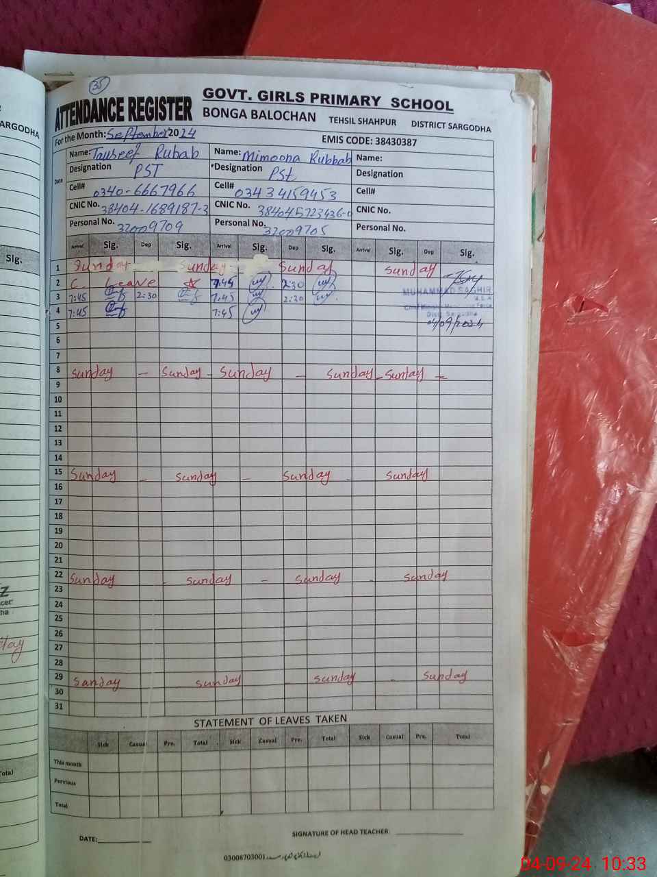 | Name: FA**** AB**** Designation: (School Headmaster's/Headmistress's) PST Phone/Cell Number: 03**** |