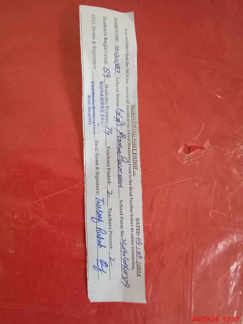 | Attendance Register | Head Teacher | MEA with School | Visit Proof |