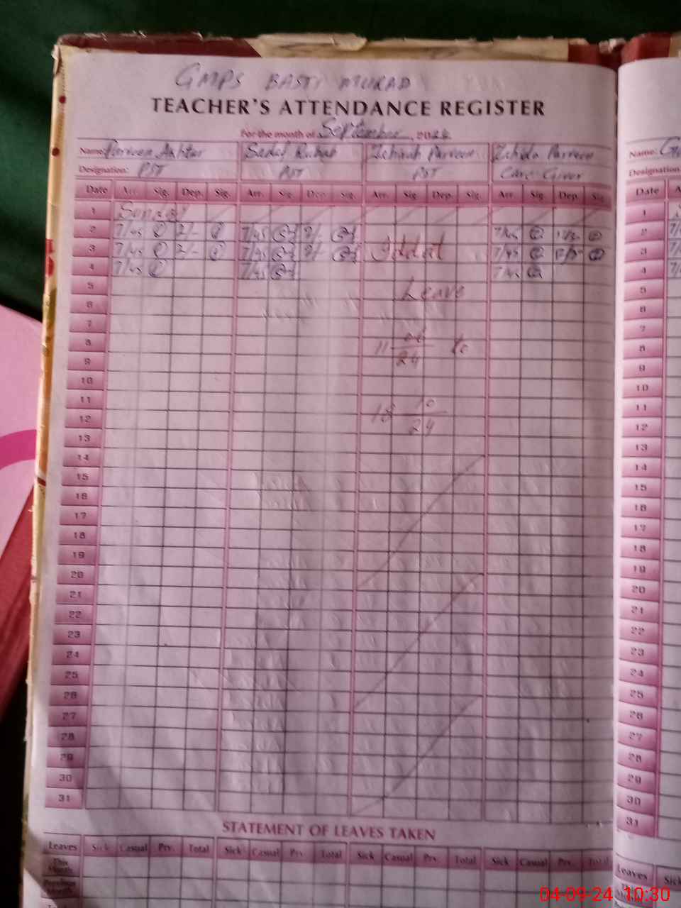 | Remarks (Use Separate Page if Required): Laraib Saleem chowkidar found absent since 15 August and till now AEO did not visit this school since march 2024 NSB record not updated since April 2024 FTF record also not made according to requirements | |||||
