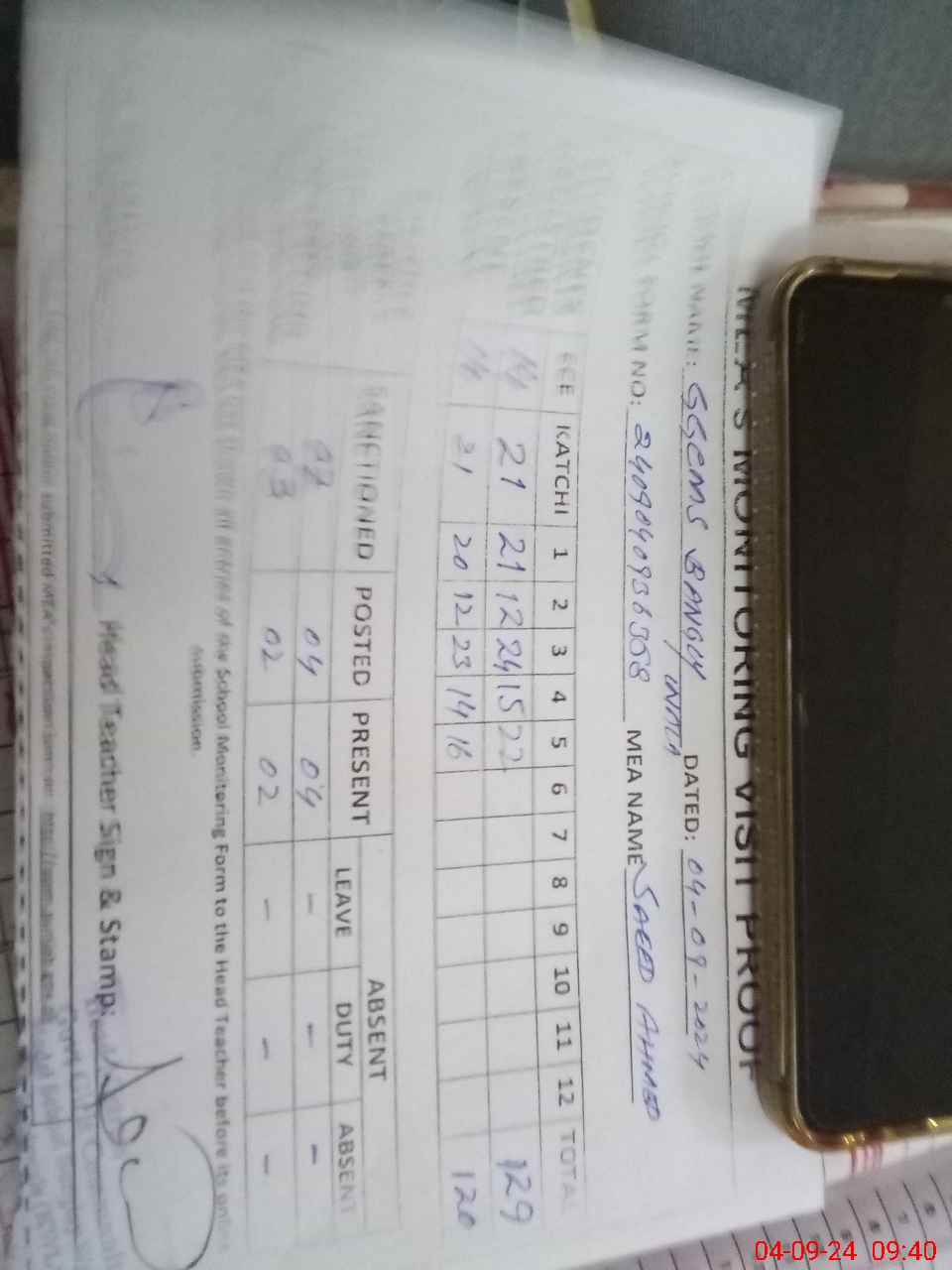 | Attendance Register | Head Teacher | MEA with School | Visit Proof |