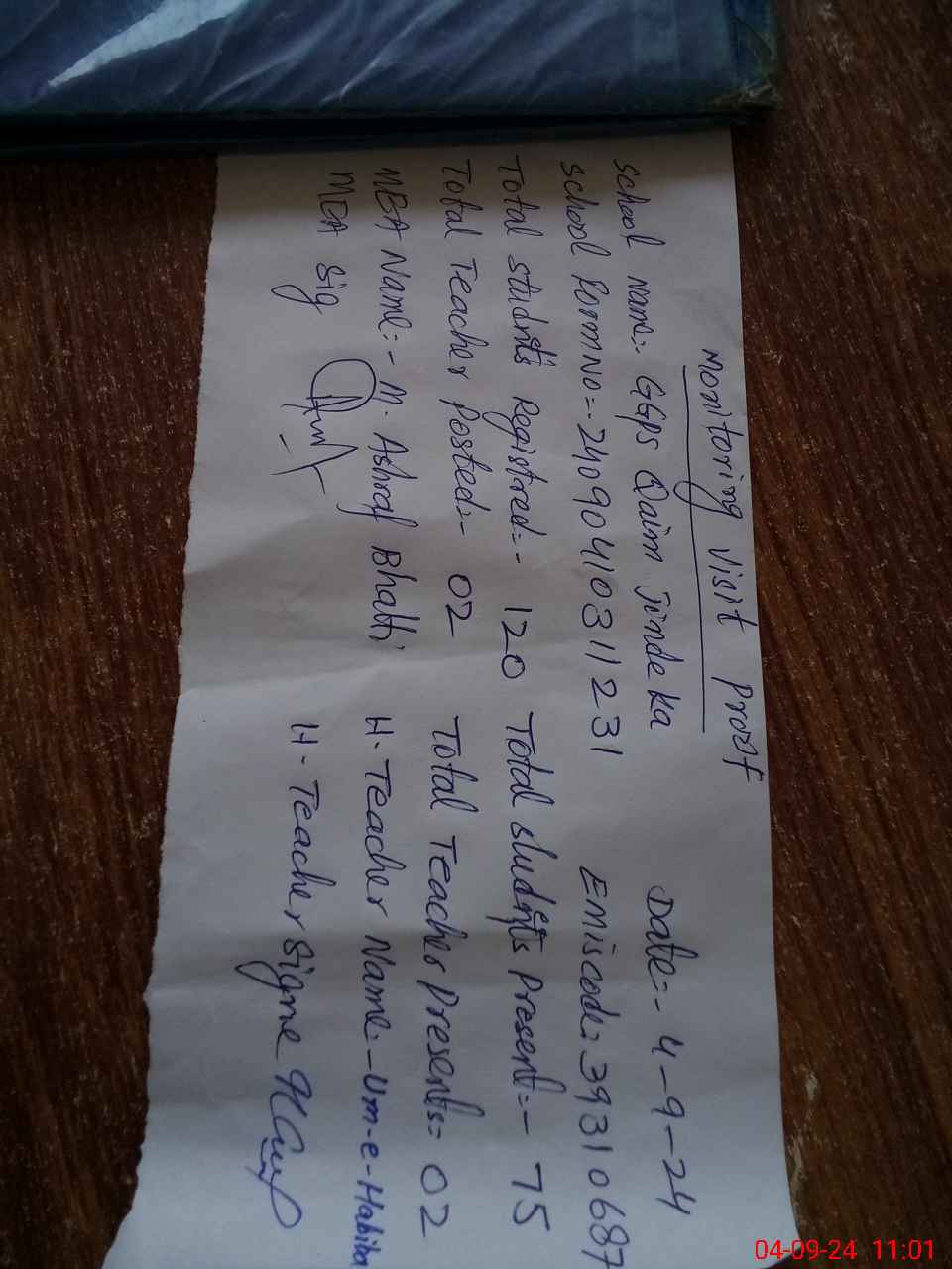 | Attendance Register | Head Teacher | MEA with School | Visit Proof |