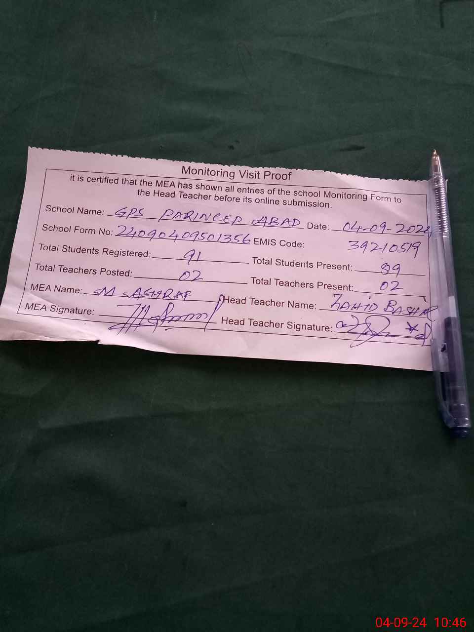 | Attendance Register | Head Teacher | MEA with School | Visit Proof |