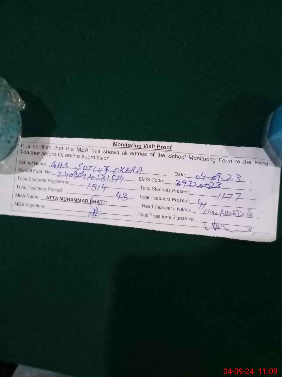 | Attendance Register | Head Teacher | MEA with School | Visit Proof |
