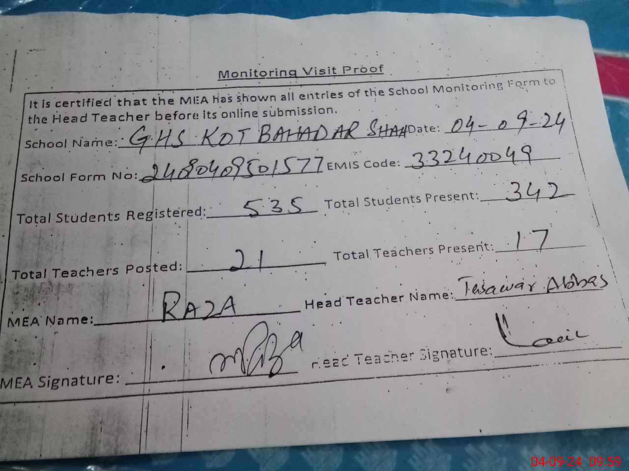 | EMIS Code: 33240049 | Name of School: GHS KOT BAHADAR SHAH | |||