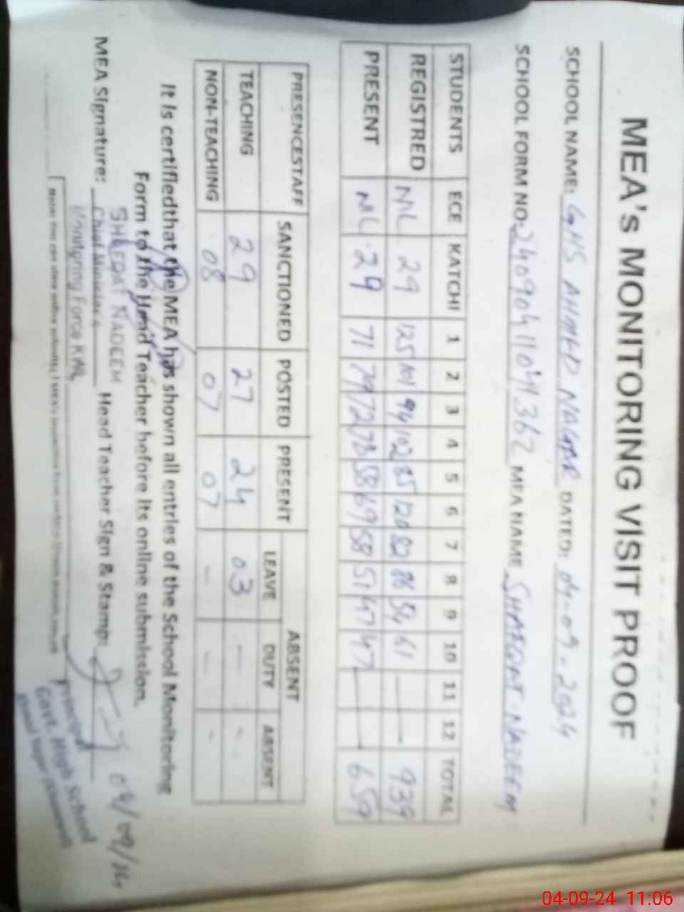 | Attendance Register | Head Teacher | MEA with School | Visit Proof |