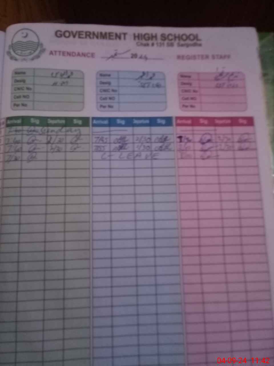 | CNIC | Full Name | Designation | R/C | Absence During Last Calender Month |