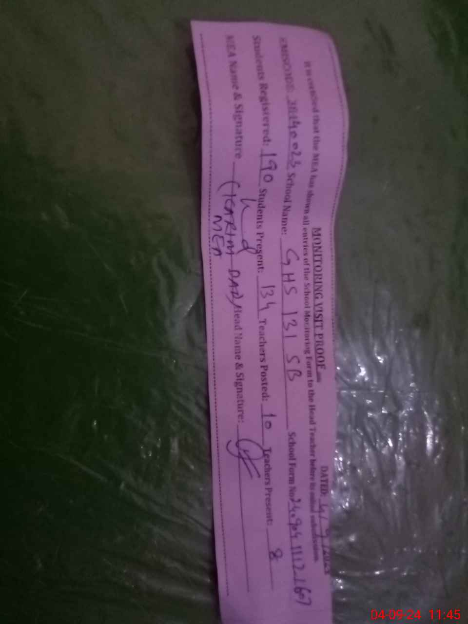 | Attendance Register | Head Teacher | MEA with School | Visit Proof |