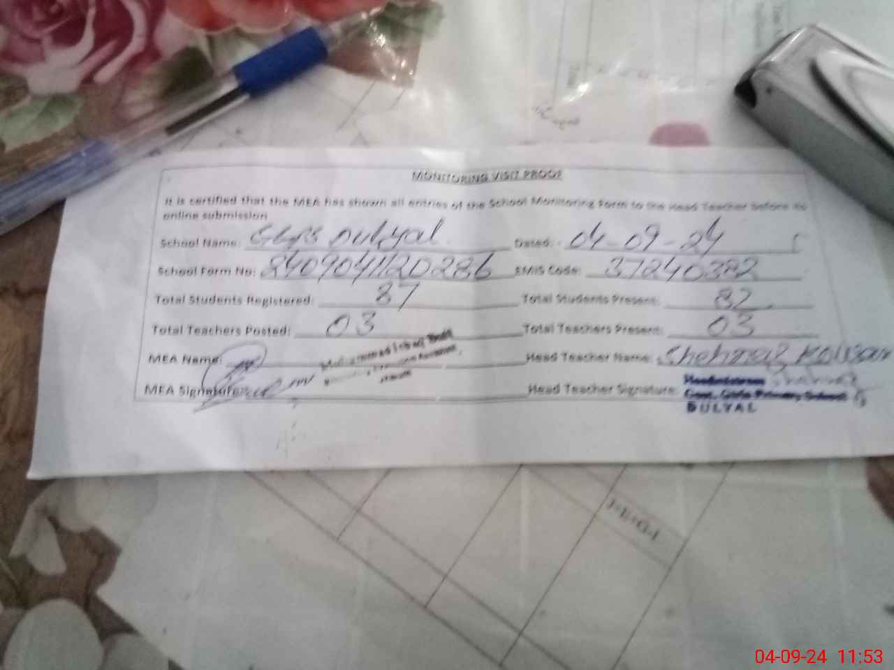 | Attendance Register | Head Teacher | MEA with School | Visit Proof |