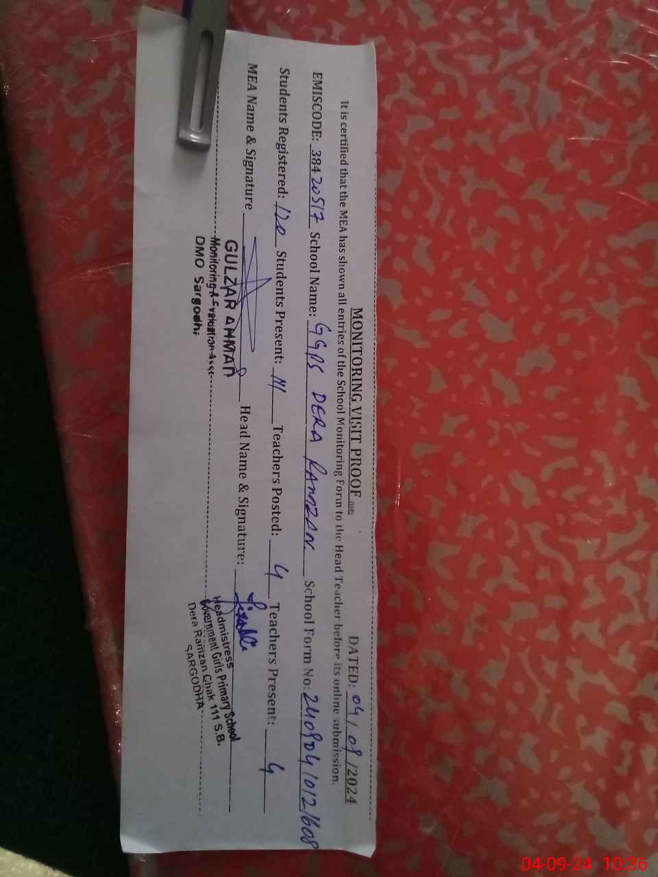 | Attendance Register | Head Teacher | MEA with School | Visit Proof |