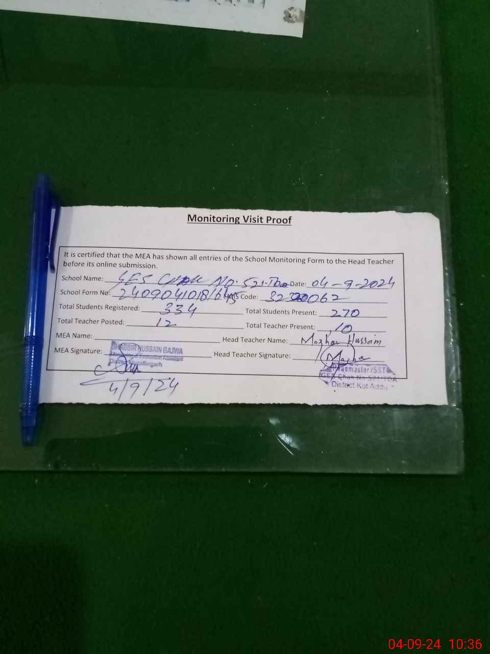| Attendance Register | Head Teacher | MEA with School | Visit Proof |