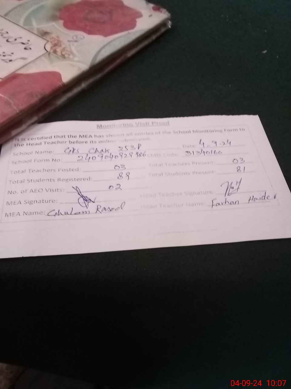 | Attendance Register | Head Teacher | MEA with School | Visit Proof |