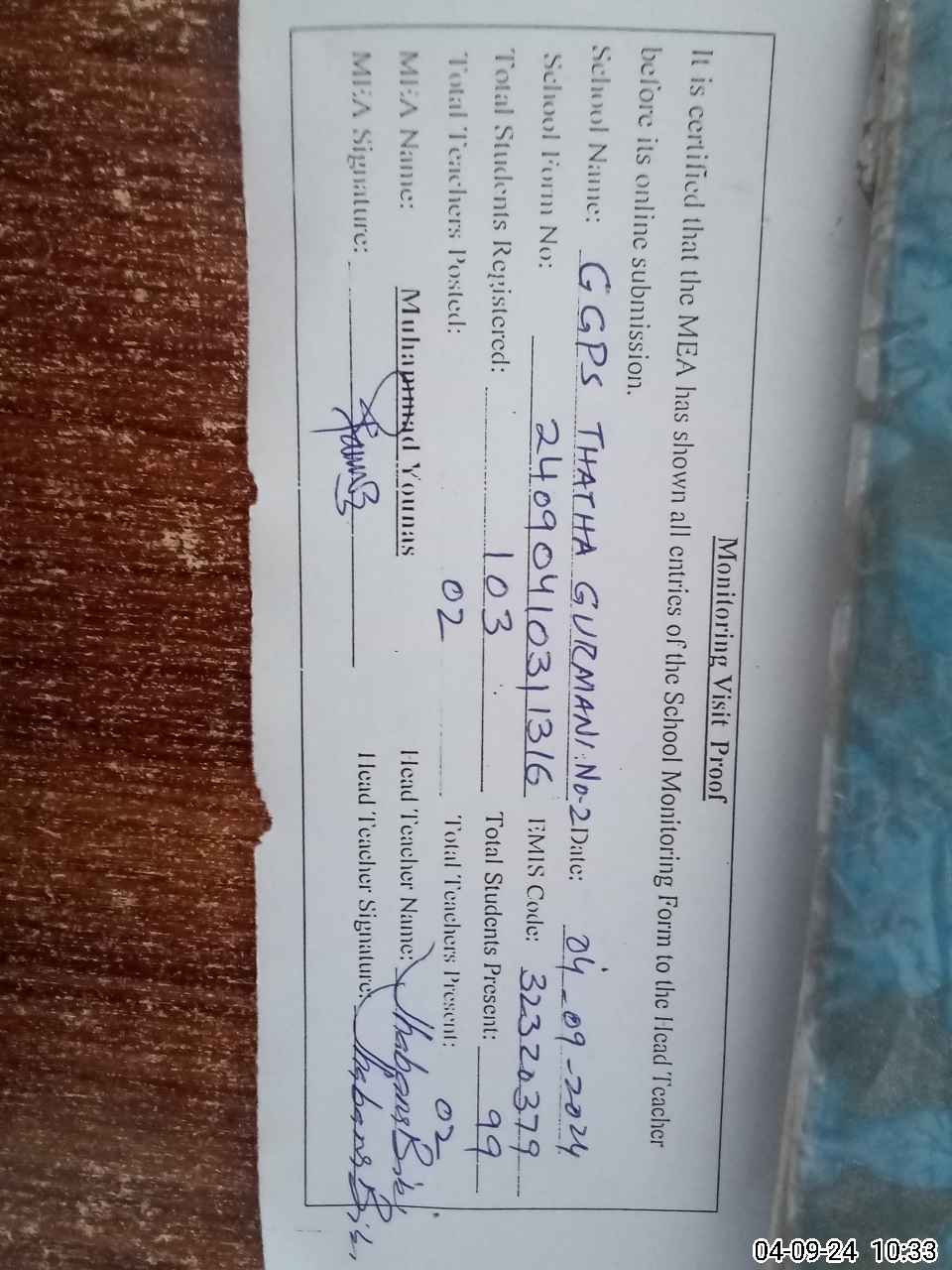 | Attendance Register | Head Teacher | MEA with School | Visit Proof |