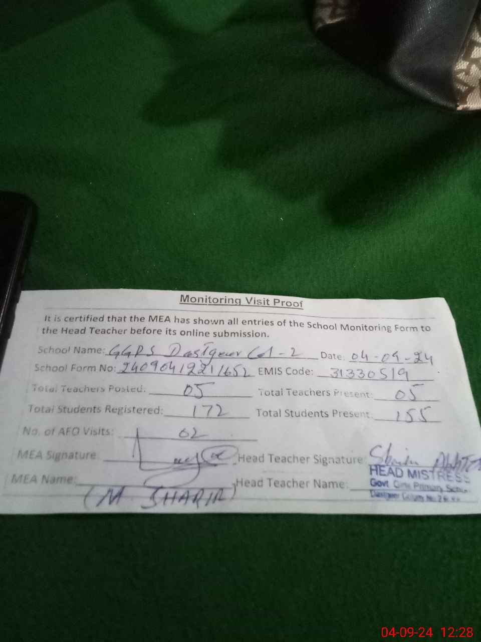 | Attendance Register | Head Teacher | MEA with School | Visit Proof |