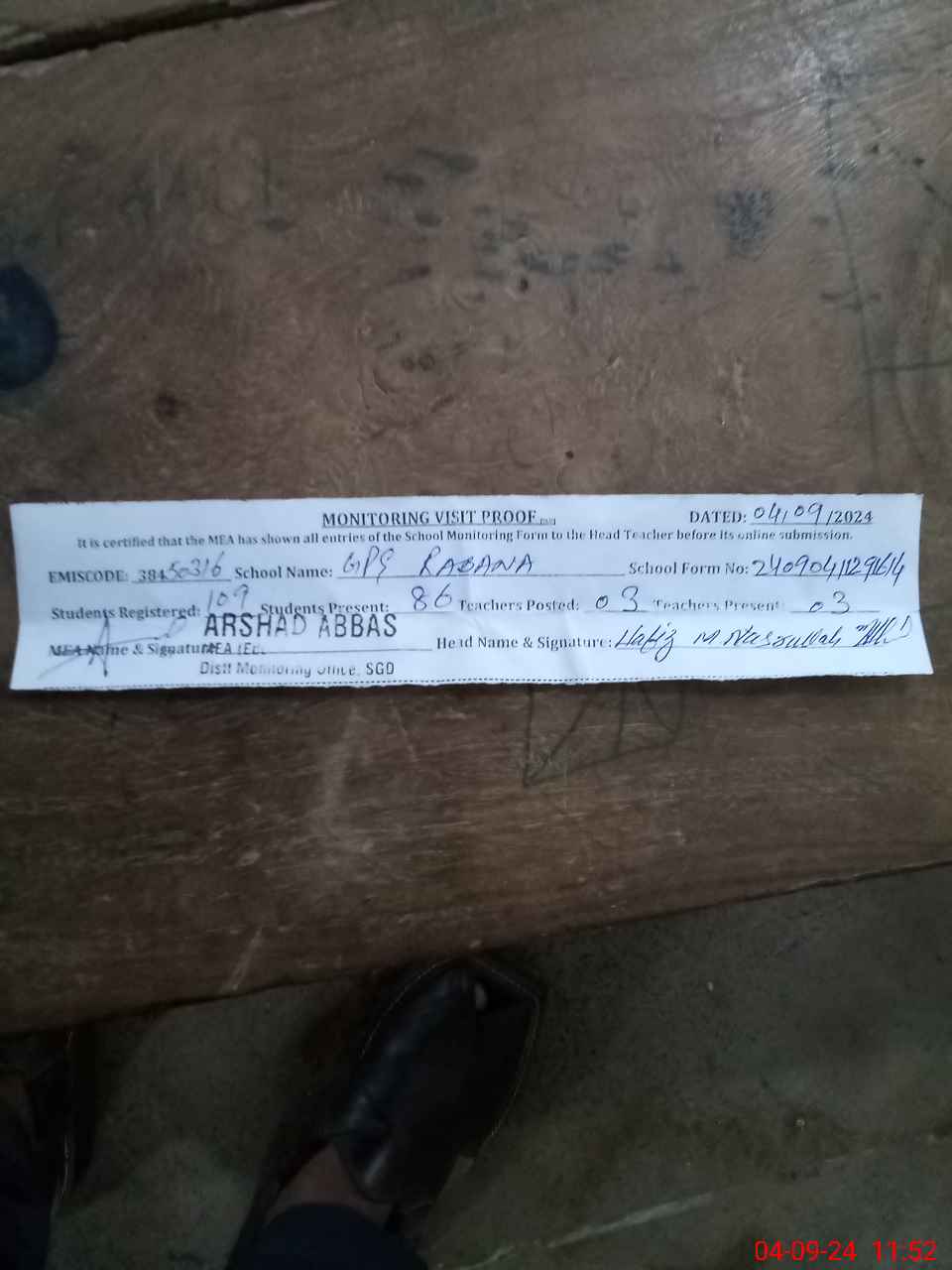 | Attendance Register | Head Teacher | MEA with School | Visit Proof |