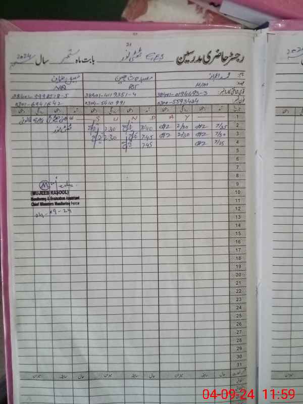 | CNIC | Full Name | Designation | R/C | Absence During Last Calender Month |