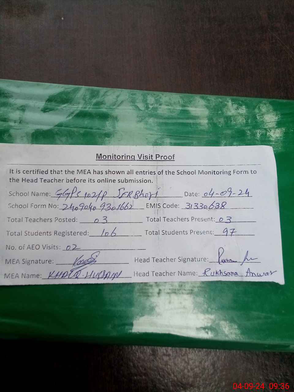 | Attendance Register | Head Teacher | MEA with School | Visit Proof |