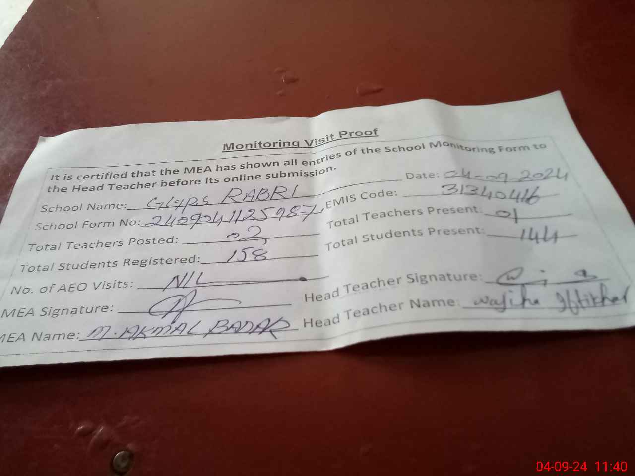 | Attendance Register | Head Teacher | MEA with School | Visit Proof |