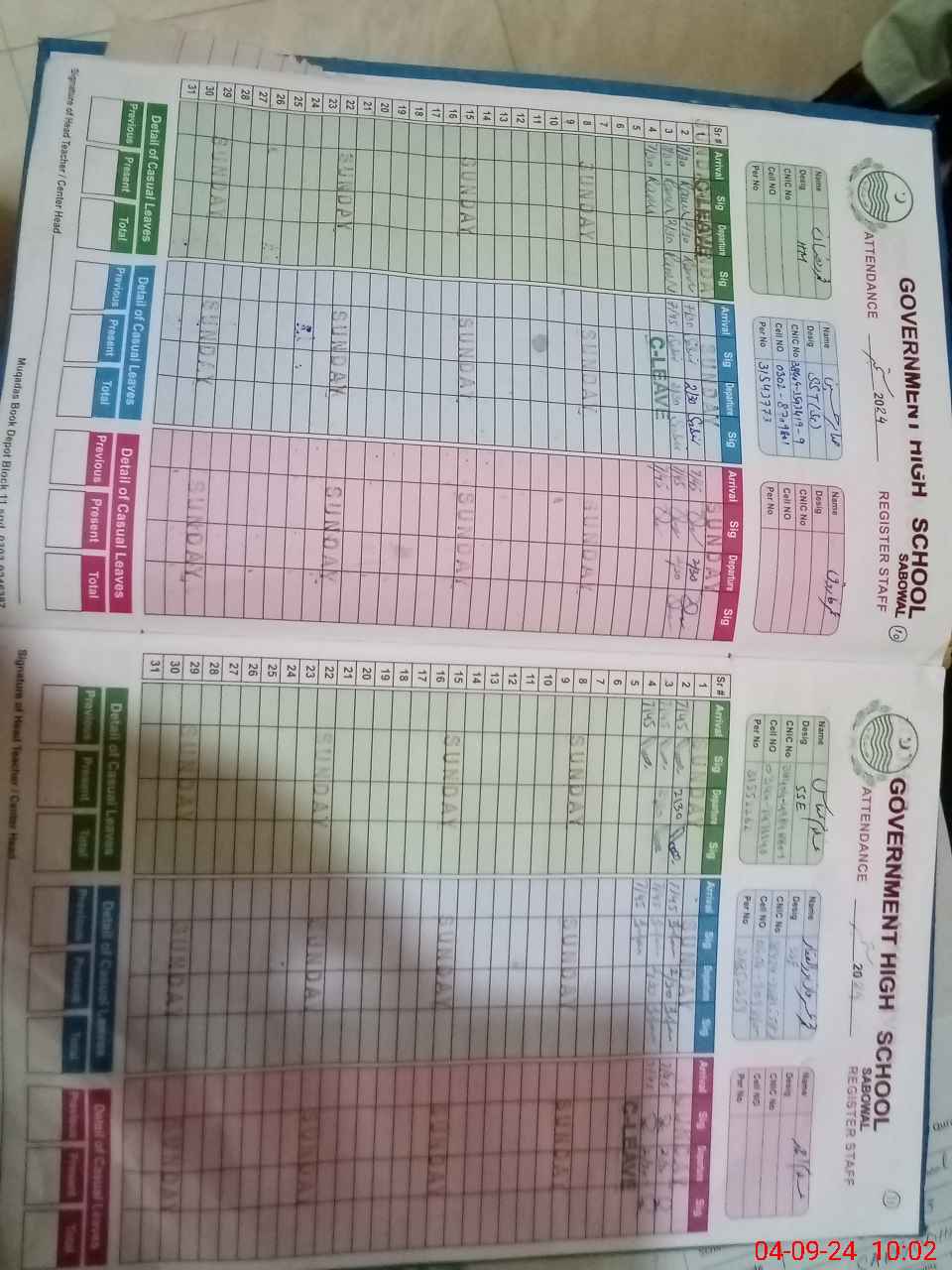| CNIC | Full Name | Designation | R/C | Absence During Last Calender Month |